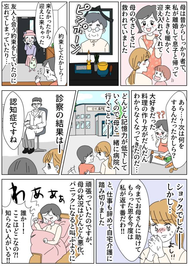 介護施設へ入れることも考えましたが、「今まで母に助けてもらってきた恩を、今度は私が返す番だ」と思い、仕事を辞めて自宅介護に踏み切ります。日中は息子も小学校へ行っていることもあり、母との時間に集中できていました。